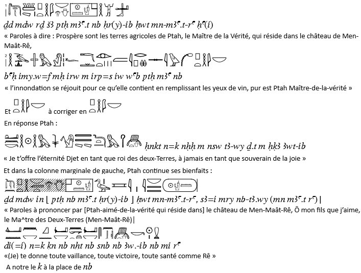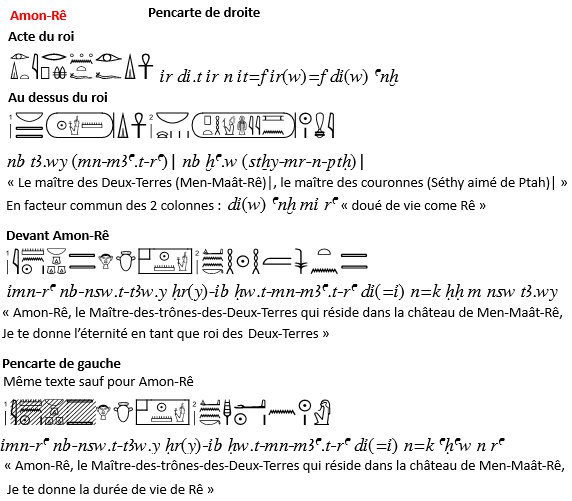 Ce qu'il faut remarquer que seuls Horus et Isis sont désignés comme résidents (Hr(y)-ib) du Château de Men-Maât-Rê. Donc en relation avec les cultes probablement effectués dans les chapelles du complexe arrière). Pour les autres divinités Amon et Rê-Horakhty, le roi est simplement aimé du dieu.