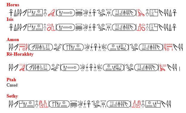 Le texte de la chapelle de Rê-Hor-akhty est le plus complet,celui de la chapelle de Séthy est tronqué, celui d'Horus, la partie droite est au complet, celui d'Isis, partie droite = 50%, partie gauche 70%, partie supérieur = 20%
