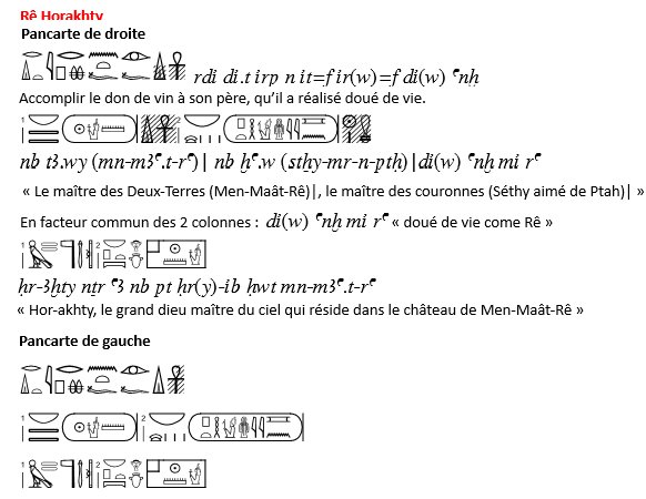 A droite et à gauche on trouve 2 pancartes, surmontées par le disque ailé "Béhédet" et le rouleau de papyrus enroulé, comme on le trouve sur toutes les portes des maisons égyptiennes.