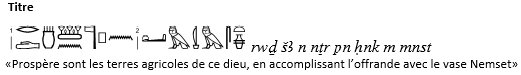 Le tout avec un énoncé-titre. ![]() Pour la notion d'énoncé titre, voir P.Vernus " La naissance de l'écriture dans l'Égypte pharaonique : une problématique revisitée", Archeo-Nil 26.§ 12,p.109. |